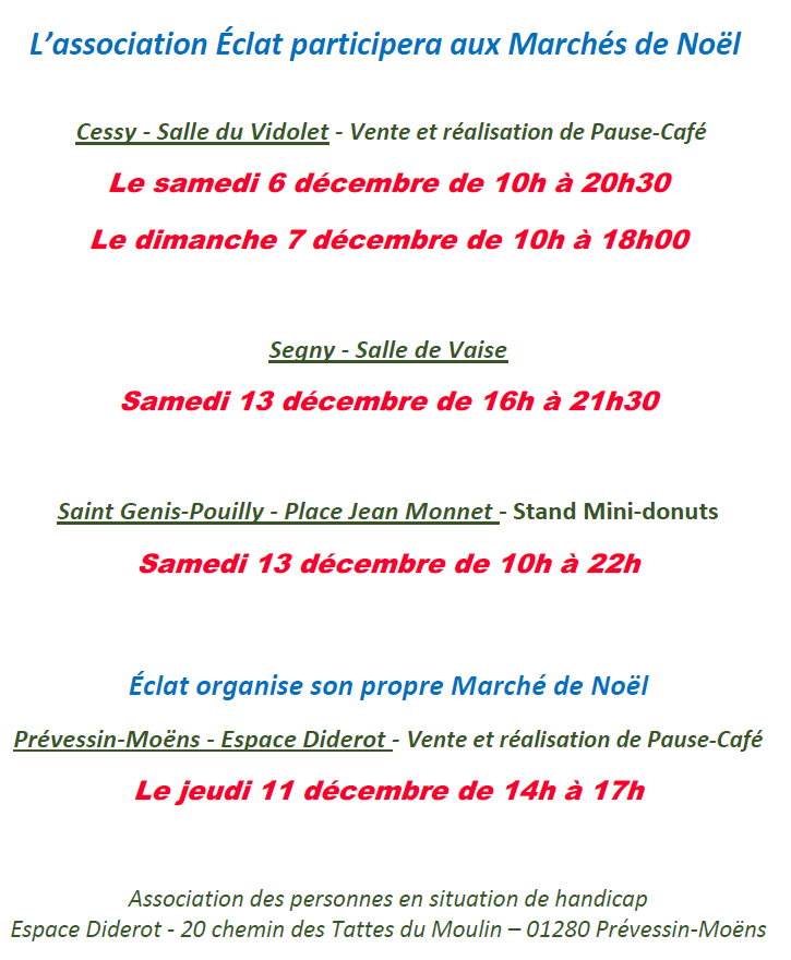 Cette année, l’association Éclat participera à plusieurs marchés de Noël dans le Pays de Gex.